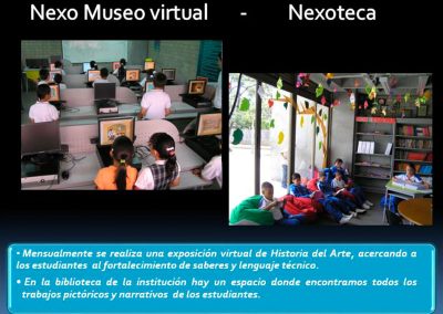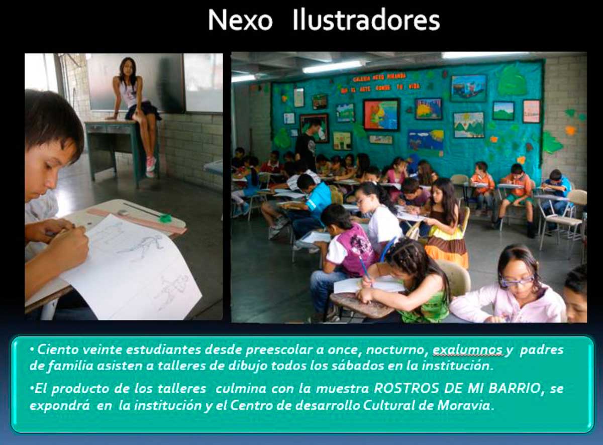 NEXO nació bajo el signo de la solidaridad. De la venta de obras no donadas y compradas a los artistas, el 50% se destinaba a causas humanitarias y el resto para cada artista. Al ver unos dibujos realizados por niños desfavorecidos de una zona de Medellin (Colombia) de la que los trajo para una muestra infantil el fotógrafo Fernando Palacios, el director de NEXO, Fernando Barredo, le propuso al artista colombiano abrir una seccion para que pudieran integrarse creadores menores de edad que trajeron espontaneidad y alegría transoceánicas.